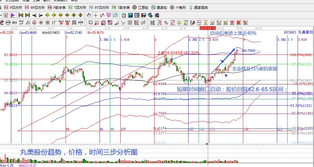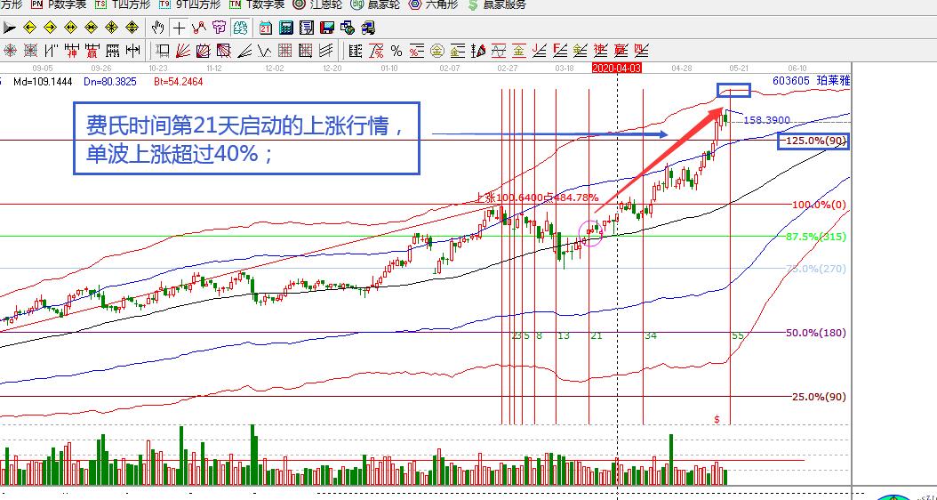 4月3日,股價處于生命線上強勢區(qū)域,趨勢上支持買入;價格處于江恩315度之上,支撐上符合買入條件,股價的上漲空間按照規(guī)則看高前期高點及藍色線。時間周期這塊,費氏時間第21天,股價上漲突破了315度,懂贏家的朋友應(yīng)該明白,這是一個強勢二買模型。事實上,股價在生命線和315度共振支撐上連續(xù)反彈,逐步創(chuàng)出了新高并突破了藍色線?! ?/p>