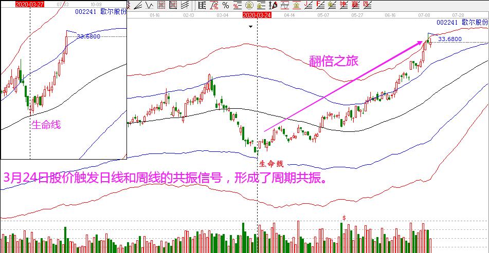 璞泰來和歌爾股份:這兩個(gè)票都是在3月底關(guān)注的,隨著大盤的一波下跌,不少績優(yōu)股也給出了更好的位置,其中,璞泰來在3月23日股價(jià)日線下跌至藍(lán)色下軌線附近,同時(shí)周線回踩到生命線,形成了超跌+最佳的周期共振信號(hào);歌爾股份在3月24日股價(jià)下跌至藍(lán)色下軌線附近,同時(shí)周線回踩到生命線,同樣形成了超跌+最佳的周期共振信號(hào)。這兩個(gè)股票隨后都是展開了翻倍的行情,也都是非常經(jīng)典的周期共振的左側(cè)交易買入案例。