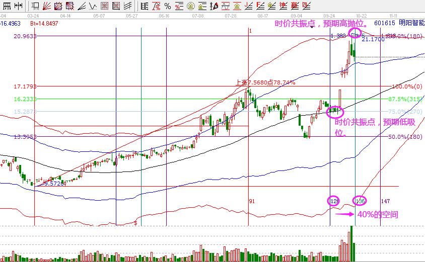 按照江恩百分比買賣法則,315度分割一旦突破,股價將創(chuàng)新高。10月9日直接高開突破前高到藍色線附近,10月13日突破藍色線,10月15日抵達紅色線以及波段百分比延伸線150%分割的20.96。短期時間窗口臨近,這波上攻進入到高拋區(qū)。生命線到紅色線的一波上漲行情就這么走了出來,股價單波上漲接近40%的空間。