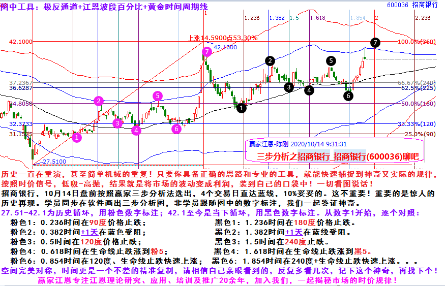 招商銀行,10月14日盤前按照贏家三步分析法選出,4個交易日直達藍線,10%妥妥的。這不重要!重要的是驚人的歷史再現(xiàn)。學員同步在軟件畫出三步分析圖,非學員跟隨圖中的數(shù)字標注,我們一起鑒證神奇。