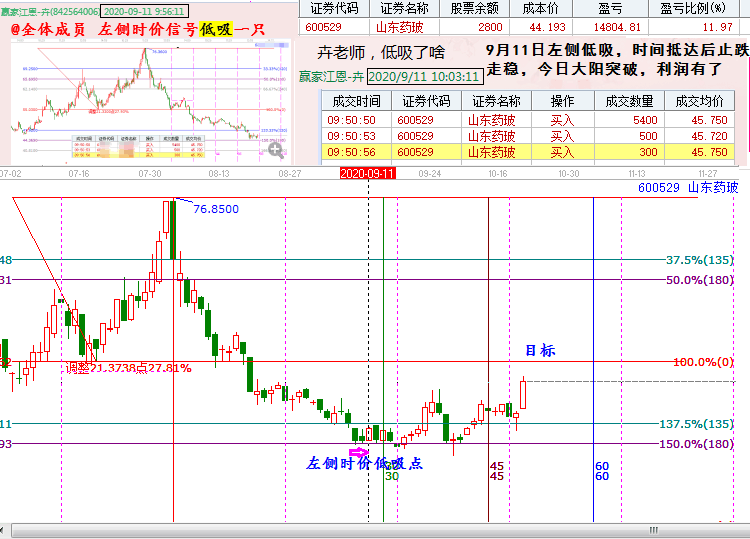 山東藥玻9月11日在群里公開發(fā)出分析圖,符合左側(cè)時價信號,同時毫不吝嗇的公開給敲門的朋友。后期該股在180度支撐止跌回升 給出2波盈利的機會。贏家江恩引領(lǐng)理性投資21年,每天盤中實盤大盤分析 個股解析和跟蹤 從一個個股選出-拉升-盈利目標,均是提前做好分析和計劃。