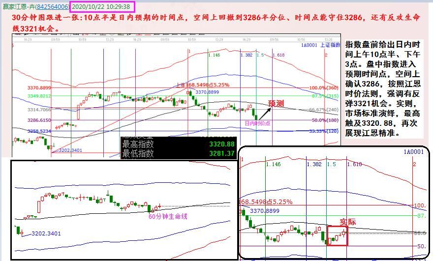 指數(shù)盤前給出日內(nèi)時間上午10點半、下午3點。盤中指數(shù)進入預(yù)期時間點,空間上確認3286,按照江恩時價法則,強調(diào)有反攻3321機會。實則,市場標準演繹,最高觸及3320.88,再次展現(xiàn)江恩精準。學員可同步畫圖學習
