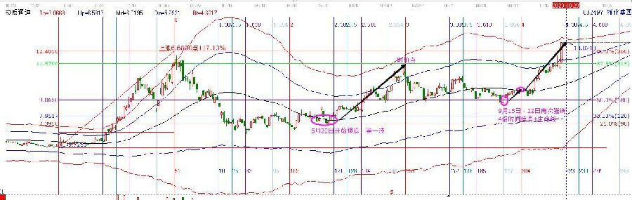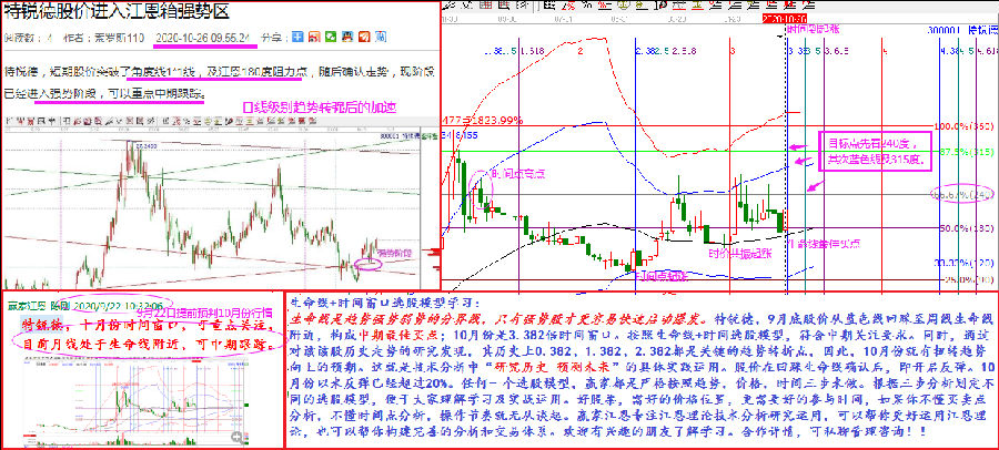 生命線是趨勢強勢弱勢的分界線,只有強勢股才更容易快速啟動爆發(fā)。特銳德,9月底股價從藍色線回踩至周線生命線附近,構成中期最佳買點;10月份是3.382倍時間窗口。按照生命線+時間選股模型,符合中期關注要求。同時,通過對該該股歷史走勢的研究發(fā)現(xiàn),其歷史上0.382、1.382、2.382都是關鍵的趨勢轉折點,因此,10月份就有扭轉趨勢向上的預期。這就是技術分析中“研究歷史 預測未來”的具體實踐運用。股價在回踩生命線確認后,即開啟反彈。10月份以來反彈已經超過20%。任何一個選股模型,贏家都是嚴格按照趨勢,價格,時間三步來做。根據(jù)三步分析劃定不同的選股模型,便于大家理解學習及實戰(zhàn)運用。好股票,需好的價格位置,更需要好的參與時間,如果你不懂買賣點分析,不懂時間點分析,操作節(jié)奏就無從談起。贏家江恩專注江恩理論技術分析研究運用,可以幫你更好運用江恩理論,也可以幫你構建完善的分析和交易體系。