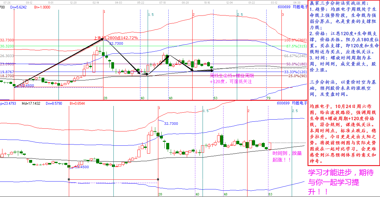 均勝電子,10月24日周六作圖,給出波段路徑,強調周線生命線+螺旋周期+120度價格線,符合規(guī)則,課逢低關注。本周時間點,標準止跌后,穩(wěn)步拉升,今日更是走出大陽之勢。將提前預測圖與實際走勢圖放在一起對比學習,會更難感受到江恩預測體系的意義和神奇。