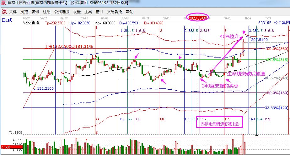 每當(dāng)我們從市場(chǎng)中通過(guò)江恩理論體系獲得利潤(rùn)的時(shí)候,我們總是會(huì)感嘆江恩理論的獨(dú)特和神奇,也感謝江恩老爺子對(duì)金融市場(chǎng)技術(shù)分析的偉大貢獻(xiàn),他引入的時(shí)間分析,是所有決定市場(chǎng)漲跌因素中最重要的因子,時(shí)間未足夠抵達(dá)前不會(huì)出現(xiàn)向上或者向下的大行情,時(shí)間因素會(huì)失衡于空間和成交量。根據(jù)時(shí)間規(guī)則,當(dāng)時(shí)間到達(dá)時(shí),不管走勢(shì)是向上還是向下,成交量開(kāi)始放大,空間才開(kāi)始打開(kāi)。因此,贏家在進(jìn)行實(shí)戰(zhàn)交易時(shí),首先考慮的就是時(shí)間因素。時(shí)間是否支撐股價(jià)的上漲,是否已經(jīng)給出方向,之后,才有交易的動(dòng)作。今天要講的公牛集團(tuán)的案例也是如此,我們借助江恩時(shí)間來(lái)感受下,市場(chǎng)的波段操作應(yīng)該怎么來(lái)做。