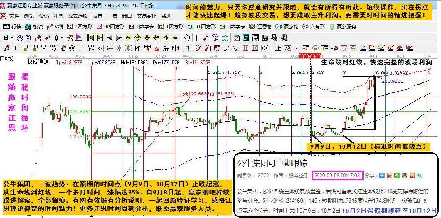 公牛集團,一波趨勢:在預(yù)期的時間點(9月9日、10月12日)止跌起漲,從生命線到紅線,一個多月時間,漲幅達35%。自9月8日起,贏家聊吧持續(xù)跟進解讀,全部留痕。有圖有依據(jù)有分析說明,一起回顧驗證學(xué)習(xí),感悟江恩理論神奇的時間魅力!