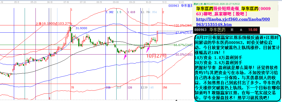10月27日依據(jù)贏家江恩系統(tǒng)極反通道+江恩時間解讀的華東醫(yī)藥000963,時價關(guān)鍵位啟動,今日放量突破藍色上軌線漲停,目前累計漲幅高達18%!