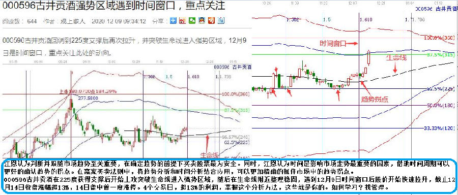 000596古井貢酒在225度獲得支撐后開(kāi)始上攻突破生命線(xiàn)進(jìn)入強(qiáng)勢(shì)區(qū)域,隨后在生命線(xiàn)附近整理穩(wěn)固,遇到12月9日時(shí)間窗口后股價(jià)開(kāi)始快速拉升,截止12月14日收盤(pán)漲幅超13%,14日盤(pán)中曾一度漲停。4個(gè)交易日,超13%的利潤(rùn),掌握這個(gè)分析方法,這些就是你的。