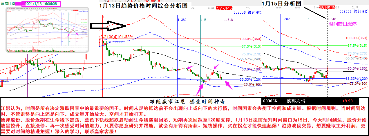 德邦股份,股價(jià)近期在生命線下震蕩,藍(lán)色下軌線超跌啟動(dòng)到生命線遇阻回落,短期再次回踩至120度支撐,1月13日提前預(yù)判時(shí)間窗口為15日,今天時(shí)間到達(dá),股價(jià)開始放量拉升,直接漲停。再一次感受時(shí)間的魅力,只要你愿意研究并跟隨,就會(huì)有所得有所獲。短線操作,買在拐點(diǎn)才能快速起爆!趨勢(shì)波段交易,想要賺取主升利潤,更需要對(duì)時(shí)間的精進(jìn)把握!深入的學(xué)習(xí),聯(lián)系贏家客服!