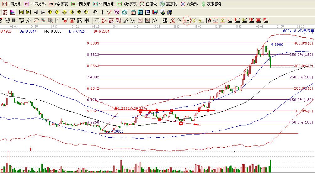 那么他的第一個(gè)目標(biāo)就是他的200% 0度位置6.17的位置。那么我們可以清楚的看到600418到這里然后就開始了震蕩洗盤,因?yàn)榇蟊P強(qiáng)勢緣故,600418經(jīng)歷過整理后再一次向300%的位置8.05發(fā)起進(jìn)攻,這里一躍而過就直接上到了400%的位置,典型的教科書的,大盤好的情況下,可能就是他的3倍位置了。