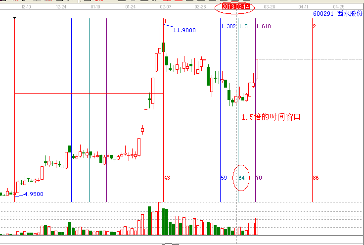 *:黃金時(shí)間周期線:依據(jù)贏家黃金時(shí)間周期線提示600291,3月14日低點(diǎn)為黃金時(shí)間周期的1.5倍的時(shí)間窗口,和江恩價(jià)格百分比的50%的位置形成四方,{使用方法:選擇一個(gè)完整的波段的高低點(diǎn),600291選擇低點(diǎn)12.4日低點(diǎn)——高點(diǎn)13年2月6日)【黃金時(shí)間延伸線是黃金分割理論和江恩等距離時(shí)間循環(huán)理論的完美結(jié)合。這個(gè)工具就是將一個(gè)完整的波段八分,這個(gè)工具主要是運(yùn)用黃金分割來(lái)預(yù)測(cè)指數(shù)和股價(jià)的變化時(shí)間的。起到一個(gè)變盤時(shí)間點(diǎn)的作用】