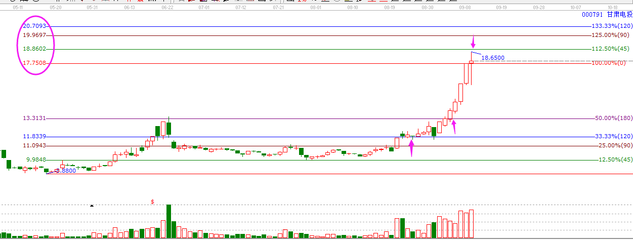 江恩圖形分析:江恩價(jià)格百分比是我們經(jīng)常使用的價(jià)格分析工具,利用百分比,我們可以很輕松的把握到單邊市場(chǎng)的價(jià)格波動(dòng)空間,阻力位以及支撐位,有效的輔助我們做好持股和交易。買(mǎi)在支撐位,賣(mài)在阻力位。突破一線看高一線。按照百分比的操作規(guī)則,在8月24日,個(gè)股甘肅電投回踩百分比33.33%的支撐位,按照買(mǎi)在支撐位的規(guī)則,形成了買(mǎi)點(diǎn)。