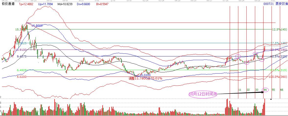 同時價格上,市場在突破225度后,出現(xiàn)回調(diào),果斷把握此位置的買點,因為10月12日時間與225度支撐價格形成共振,所以,早盤調(diào)整期間,果斷的加倉買入,當天漲停藍色線。
