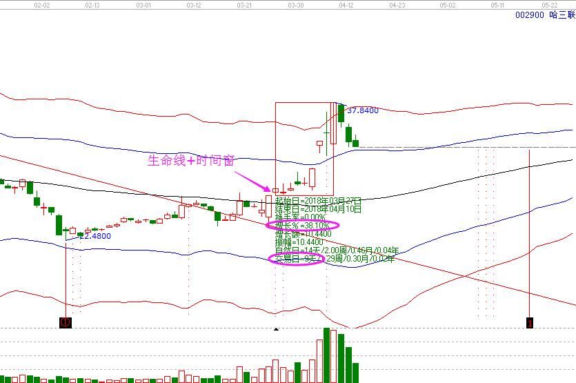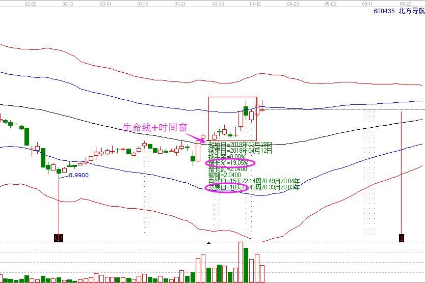 生命線和時間窗共振的位置啟動,上藍(lán)色上軌線位置,再到紅色上軌線位置,之后從紅色上軌線開始回落,走出一波完整的上漲波段。3月27日至4月10日高點,共9個交易日,漲幅空間近40%,生命線+時間窗盈利模型完美驗證。