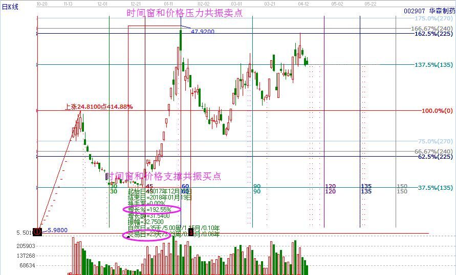 按照上述的理論基礎(chǔ),贏家江恩依據(jù)時(shí)間窗和價(jià)格支撐共振的買(mǎi)點(diǎn)模型,于2017年12月15日選股華森制藥,截止2018年1月19日,共29個(gè)交易日,上漲近2倍,一波大妖形成。
