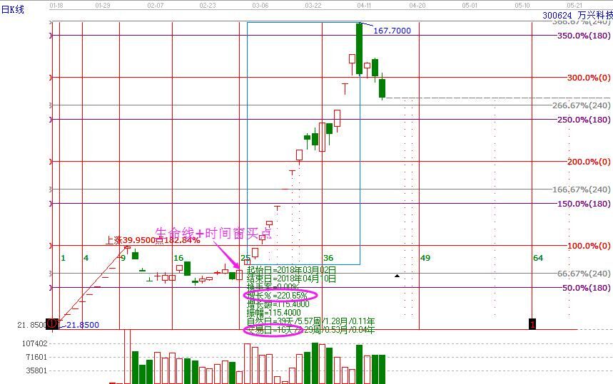 按照時(shí)價(jià)共振擒妖模型,3月1日萬(wàn)興科技時(shí)間窗和價(jià)格支撐出現(xiàn)共振,形成擒妖模型。贏家江恩在3月2日果斷買(mǎi)進(jìn),一路持股,截止4月10日高點(diǎn),共16個(gè)交易日,實(shí)現(xiàn)翻2倍上漲。