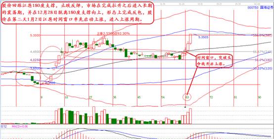 國(guó)海證券股價(jià)回踩江恩180度支撐之后止跌反彈,股價(jià)在完成拉升第一波之后進(jìn)入長(zhǎng)期的橫盤(pán)震蕩期,并在12月28日脫離180度支撐向上,形態(tài)上完成反包,股價(jià)在第二天1月2日江恩時(shí)間窗口率先啟動(dòng)上漲,進(jìn)入上漲周期。