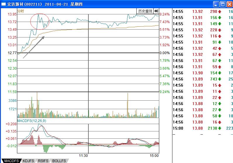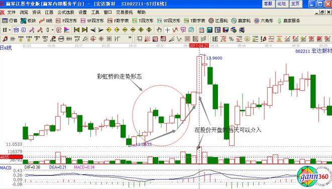 如圖宏達新材(002211)在2011年4月份的股價走勢變化,股價一直處于明顯的上漲趨勢中,而且在上漲的過程中出現(xiàn)的陽線多于陰線的走勢,4月8日的時候股價開始了一根大陽線的拉升走勢,之后出現(xiàn)的回調(diào)形成了“彩虹橋”的基本走勢形態(tài),對應的量能配合比較合理,形成的是量升價漲,價跌量縮的基本走勢形態(tài)。