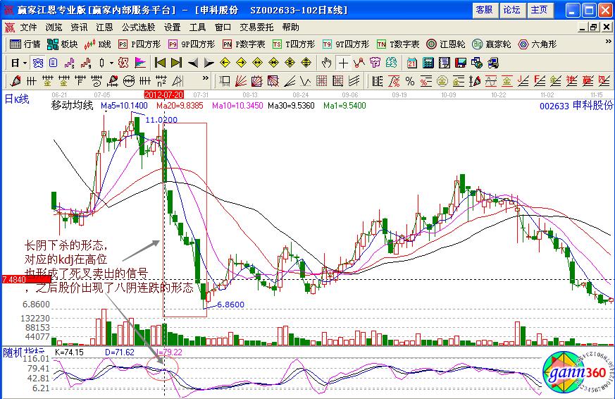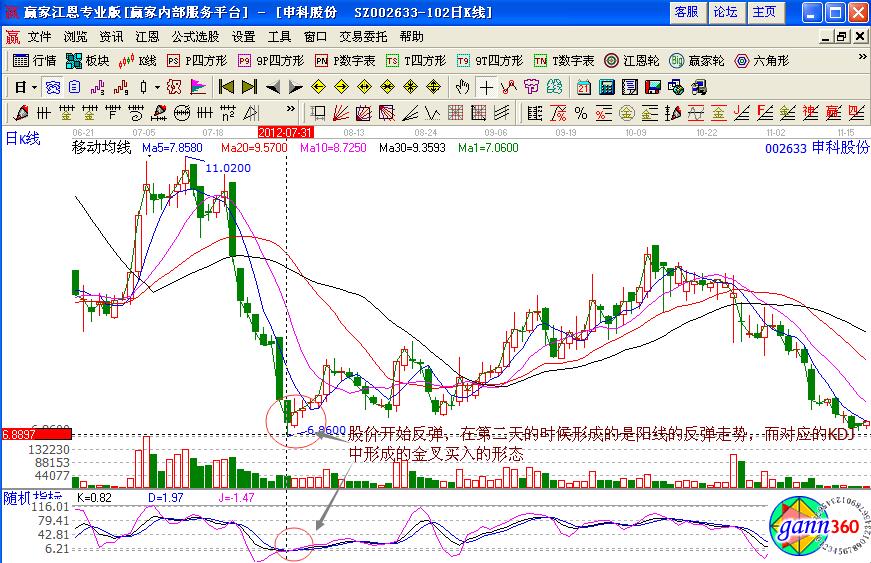 如果感覺(jué)對(duì)這一則實(shí)例的應(yīng)用不是很熟練,我們可以在觀察一則實(shí)例重點(diǎn)分析kdj指標(biāo)的應(yīng)用,比如中信國(guó)安(000839)的周K線走勢(shì)圖,在2011年11月中旬的時(shí)候股價(jià)在9.87元的位置見(jiàn)頂之后,出現(xiàn)連續(xù)的急跌,形成雪崩式下跌形態(tài),是八連陰的K線組合,在出現(xiàn)第6根陰線的時(shí)候,其kdj的J值是-0.27,而且連續(xù)三周出現(xiàn)的都是負(fù)值,而且在第9周的時(shí)候,收出陽(yáng)線,說(shuō)明多頭開(kāi)始改變被動(dòng)的局面,投資者可以考慮逢低介入搶注反彈。