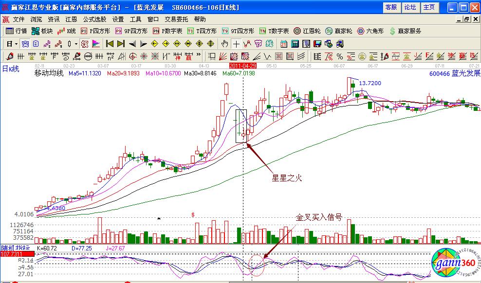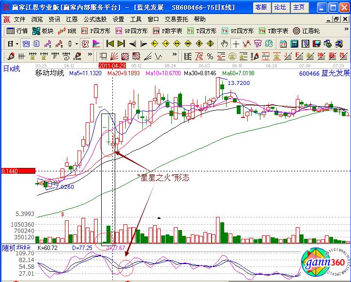 咨詢:13333833889無論是在下跌的走勢行情中還是上漲的走勢變化中,十字星可以說都是變盤的信號,特別是用股票行情軟件在大跌行情中分析的“星星之火”形態(tài),就是意味著股價(jià)筑底已經(jīng)完成,是反彈上漲的征兆。接下來我們就通過藍(lán)光發(fā)展的實(shí)例進(jìn)行分析。