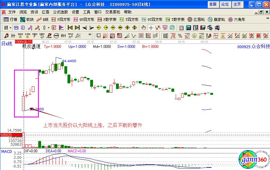 如下圖案例*ST東鉭(000962)在2000年1月20日上市,開盤價24.4元便成為最低價,當(dāng)日強勢上攻,以幾乎最高價33.08元報收,成交4500萬股,約占流通盤6500萬股的70%,明顯屬于主力資金的拉高建倉行為,第二天低開高走,以光頭的陽線報收。至此,可基本確定為一頭短線瘋牛,投資者即可及時跟進(jìn),其后短短數(shù)天升幅高達(dá)50%。