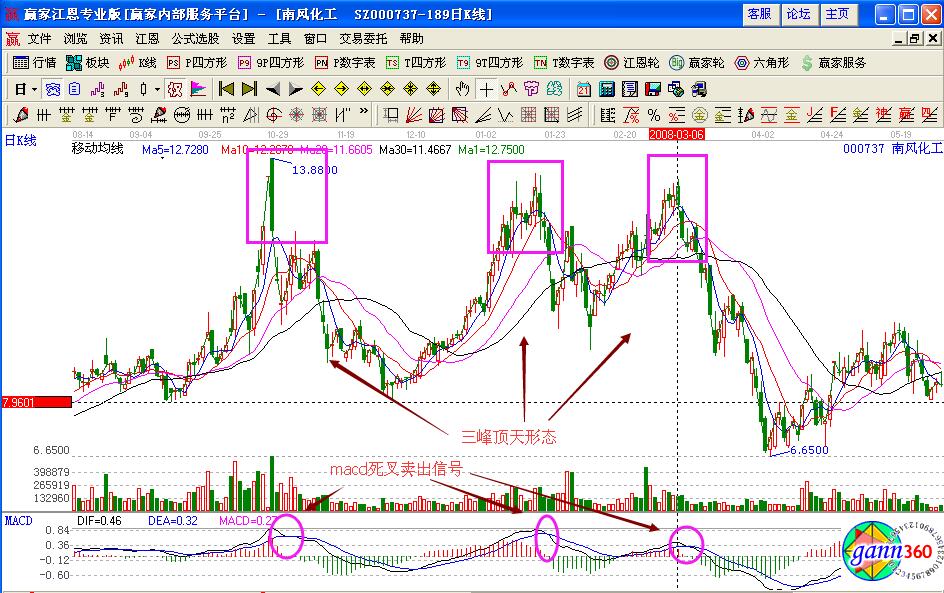 如圖南風(fēng)化工(000737)在2007年10月到2008年2月初的股價(jià)走勢(shì)形態(tài),形成了三次不同的頂部形態(tài),也就是所謂的“三峰頂部”,預(yù)示著賣出的操作信號(hào),高點(diǎn)位置,對(duì)應(yīng)的量能放大,而且macd指標(biāo)也給出的死叉的賣出信號(hào),都是一個(gè)比較好的賣出點(diǎn)位置。