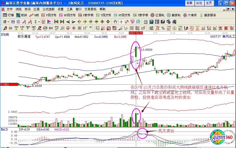 進(jìn)行細(xì)致的分析,觀察該股在07年10月25日的股價(jià)走勢(shì),前期股價(jià)經(jīng)過上漲拉升,進(jìn)入強(qiáng)勢(shì)區(qū)域運(yùn)行,最后在25日形成了一根大陰線向下跌破了極反通道紅色外軌線,第二天向下跳空跌破藍(lán)色上軌線,成交量形成巨型陰量柱,是一個(gè)賣出的操作信號(hào),投資者應(yīng)該及時(shí)賣出獲利。