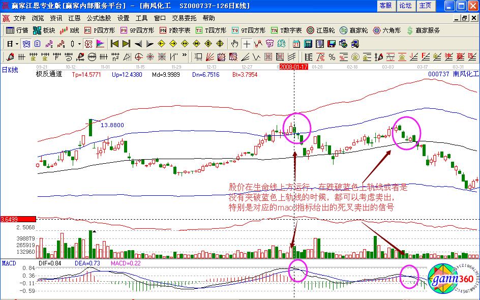 同理觀察該股在2008年1月12日和3月6日形成的階段性頂部,可以看出第二峰和第三峰的股價(jià)均低于第一峰,而且股價(jià)逐漸下跌的走勢(shì),所以在圖中,股價(jià)運(yùn)行沒有突破藍(lán)色上軌線的位置,在結(jié)合macd的死叉賣出信號(hào),應(yīng)該及時(shí)的進(jìn)行賣出獲利操作,以規(guī)避后市的下跌損失,而且依據(jù)三峰頂天的使用原則,可以明確,第三峰是最后逃命獲利的信號(hào),投資者要及時(shí)的把握操作機(jī)會(huì)。