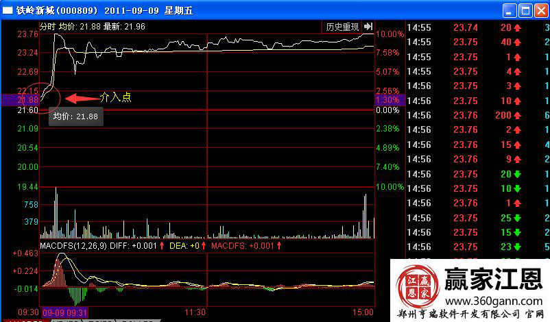 想要買入就需要選擇合適的買入點位置,分析該股在2011年9月9日的分時圖走勢形態(tài),從中能發(fā)現(xiàn),該股開盤之后就向上拉升,第一個介入點的位置是開盤集合競價的階段,之后股價在拉升過程中,出現(xiàn)了向下回落的走勢,投資者可以下分時線回踩均價線的位置進行買入操作,之后股價一直在均價線上方運行,最終拉升漲停板。