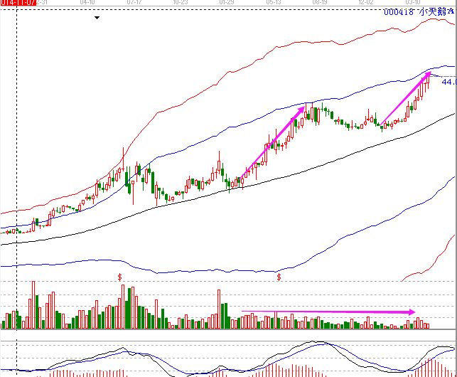 上漲無量是股票比較強(qiáng)勢的走勢,到極致就是無量漲停。無量上漲是成交量少,沒有此票的人很那買到。而有這票的人就只需等待上漲即可,這些股票一般出現(xiàn)在莊家對(duì)于股票高控的時(shí)候,少量的成交量就能夠帶來股價(jià)的上漲,最近的小天鵝A的走勢就是如此,我們從周線上可以明顯的看出來。