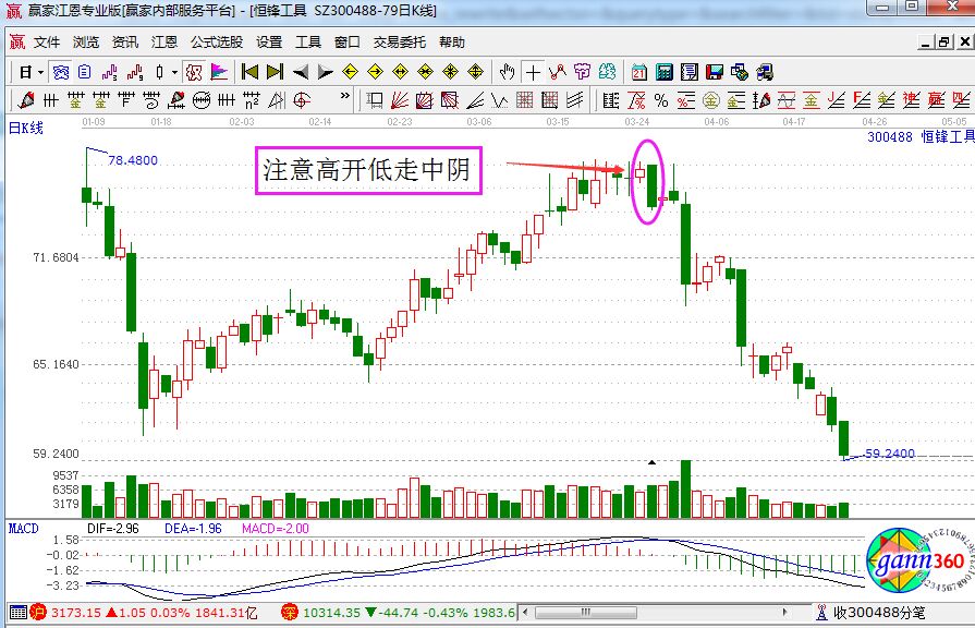 當(dāng)個(gè)股在一定的拉升之后,出現(xiàn)高開(kāi)低走,收中陰線的時(shí)候,說(shuō)明市場(chǎng)繼續(xù)拉升的意愿不強(qiáng),很可能是中線持倉(cāng)者在大量的拋售,后面很可能繼續(xù)回調(diào),所以要及時(shí)的出局,防止被套。