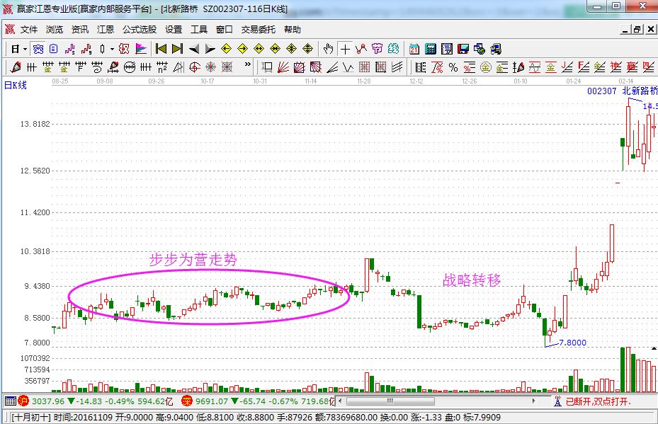 擺動交易的底部至頂部的上行段為“步步為營”階段,該階段的日K線組合特點為上漲有量,下跌縮量,股價穩(wěn)步上行。如下面就是運用炒股軟件所截取的北新路橋走勢圖。