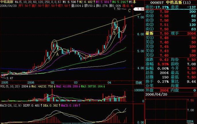 圖中的A、B兩點畫出個圓,那么我們就可以得到了一對蛤蟆眼是炯炯有神,60日與120日平均線就是蛤蟆張嘴,這是一種標準的莊股形態(tài),即金蛤蟆形態(tài)。圖中的AB線就是蛤蟆眼線,圖中前一天K吸納沖高該線,就是一種非常好的買入信號。