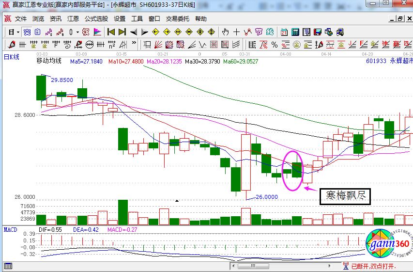 上圖是永輝超市在2011年4月份的日K線走勢圖,該股從階段性的高點29.85的價格開始進行一路下跌,而且在這期間還出現(xiàn)了跳空下跌,但是在4月份11日的時候就走出了寒梅飄盡形態(tài),最后一根K線將墻面的兩根陰線全部吞沒,顯然是階段性的底部反攻形態(tài),同時對于的macd指標形成了金叉,顯然是一個買入信號,所以此時投資者只需要觀察次日的走勢,如果是出現(xiàn)在低開的陽線走勢,那么就可以大膽的介入了,這樣就可以等后市的操作從而進行獲利。