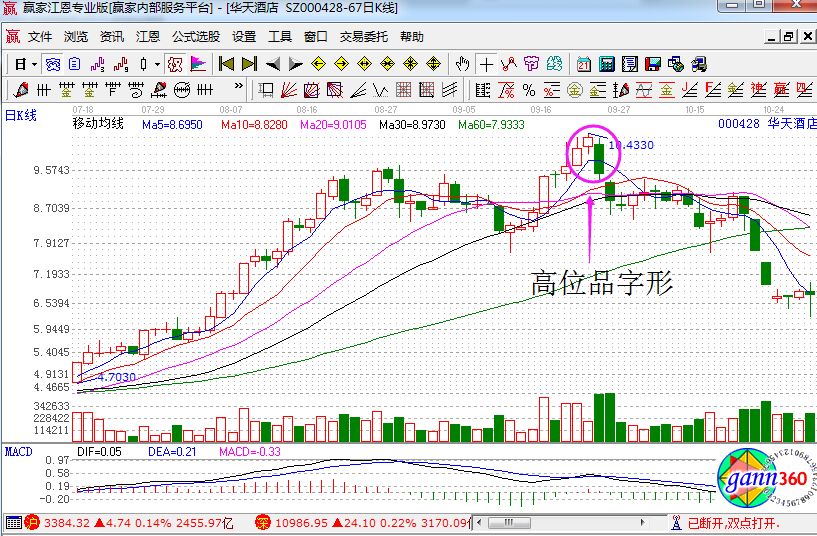 高位品字形是什么?它其實(shí)與黃昏之星形成的機(jī)理和內(nèi)涵基本上一只,但是不同的是第二根K線不要裘缺口、十字星、星形線這種極度收斂的形態(tài),一般來(lái)說(shuō)小陽(yáng)線、小陰線的出現(xiàn)次數(shù)最多,偶爾有中大養(yǎng)心啊或者陰線,這種形態(tài)的第二根K線判斷頭部的意義并不明顯,一般都要等到第三根中大陰線的時(shí)候才能判別頭部基本上形成,如下圖所示。