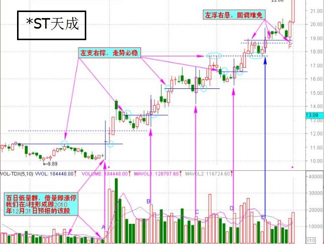 根據(jù)上面的特點(diǎn),那我們在找尋十字架的時候就會非常的簡單了。具體的就是:首先找到走勢重工的將軍柱,用豎線標(biāo)示出來,其次就是換出該將軍柱的攻防線,最后就是講共防線切合該線病形成了左支右撐形態(tài)的,那就是黃金十字架了,如下圖中的*ST天成走勢圖。