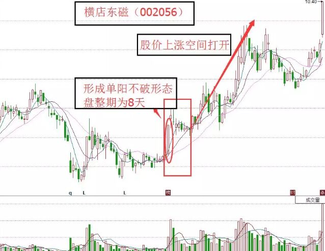 當市場進入了強勢階段時,20日均線拐頭向上而且向上持續(xù)延伸的時候,這個階段出現(xiàn)的單陽不破”形態(tài)才能夠介入買進。