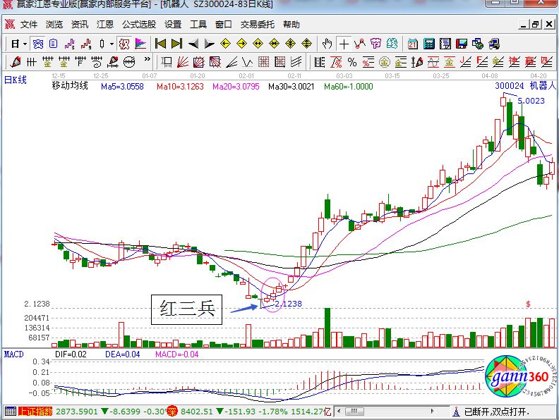 上圖是機(jī)器人在歷史上的走勢(shì)圖,從圖中我們可以看到,這指一個(gè)經(jīng)典的底部,先是倒錘子線和底部大量組合,隨后出現(xiàn)了金針探底完成了底部的確認(rèn),最后是一個(gè)紅三兵多方炮,最終股價(jià)完成了漂亮的V形反轉(zhuǎn)。底部出現(xiàn)紅三兵后股價(jià)在11個(gè)交易日漲幅67%,威力可見一斑,而且這個(gè)股票均線和趨勢(shì)最佳買點(diǎn)同時(shí)出現(xiàn),顯然就這樣就給大家?guī)砹撕芏噘I入的機(jī)會(huì)。