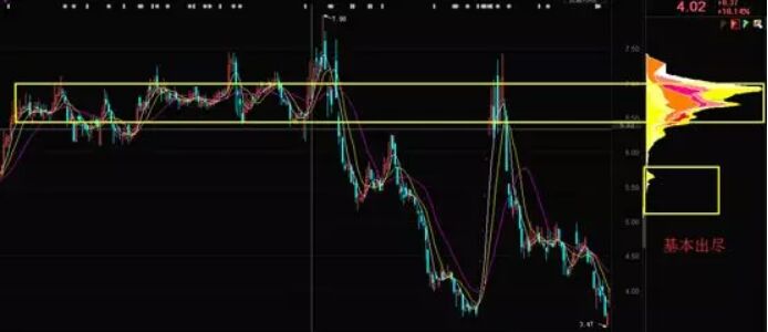 如上圖所示,股價(jià)后期又被拉升起來,但是也并沒有再創(chuàng)出多么靚麗的新高,是因?yàn)橛械闹髁Y金被套了,因此主力進(jìn)行自救,將K線拉回高位。此后K線在這個(gè)位置進(jìn)行了高位震蕩,是因?yàn)橹髁υ谶@個(gè)過程中逐步出貨,知道主力貨物基本出盡。如下圖所示,當(dāng)籌碼都在高位時(shí),說明主力跑的差不多了,后期股價(jià)就難以繼續(xù)上漲,而是開始下跌了。