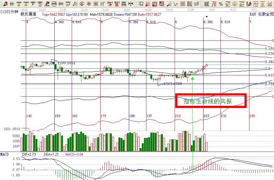 在黃金上穿極反通道生命的時候,指標macd 柱子是紅色的,但是黃白線沒有上0軸不夠強勢。當指標macd黃白線上0軸 的時候,柱子也是紅色的時候,這個時候黃金在上面突破極反通道生命線然后回踩生命線。指標macd跟贏家極反通道形成了共振的買點。