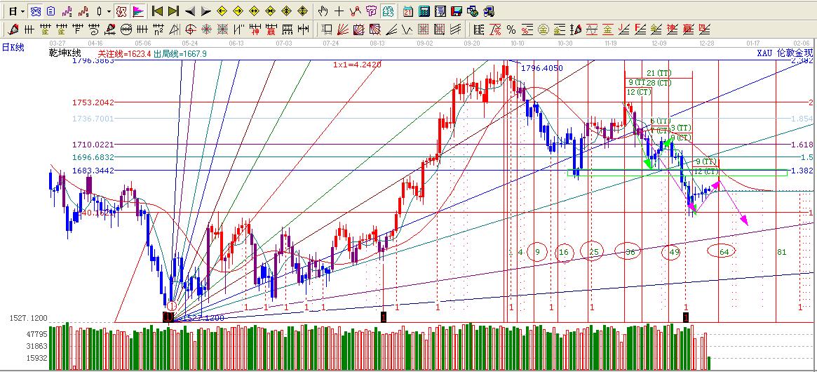 按照歷史我們去復制一個969【實際是968】一個循環(huán)這一波反彈強壓力在黃金分割1.382位置1683.3及1672.5這里將構成一個強的壓力區(qū)間,如果時間跟價格平衡,那么黃金在一次上演多空大戰(zhàn)。