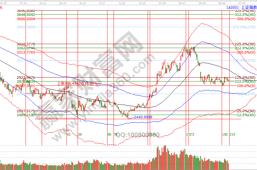指數(shù)連續(xù)兩個交易日收盤在贏家江恩系統(tǒng)工具分析的關(guān)鍵區(qū)2880-2890之間,周一盤中擊破2880后收復(fù),此區(qū)間是江恩價格圖表四方形和60分鐘極反通道生命線,運用多周期結(jié)合判斷,關(guān)鍵位不破保持市場延續(xù)反彈的觀點。如受外因不確性因素影響,波段百分比延伸線2834點是強支撐,該位置是近1個多月來箱體震蕩平臺下沿,重要性不言而喻。反彈第一目標(biāo)位2950位置,第二目標(biāo)位是日線黑色生命線,在可承受的風(fēng)險持倉內(nèi)保持平和的心態(tài)應(yīng)對市場。6月18號盤中壓力是135度2911點、180度2928點,盤中支撐是0度2860、315度2844點。操作策略,指數(shù)處于極反通道弱勢區(qū)域的反彈走勢,繼續(xù)關(guān)注2880-2890區(qū)間得失,整體持倉保持3-5成。