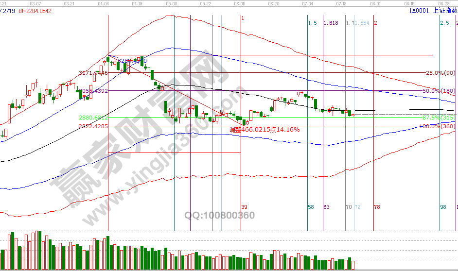 23(24)號是贏家江恩時(shí)間工具測算本月最后一個(gè)時(shí)間時(shí)間窗口,8號中陰后橫肋第12天,按費(fèi)氏時(shí)間線做圖25號是第13天,這是短線時(shí)間極限窗,進(jìn)入方向博弈決戰(zhàn)期。趨勢方向,三大指數(shù)深指、創(chuàng)業(yè)板在日線極反通道生命線上運(yùn)行,滬指線下弱勢區(qū)運(yùn)行,深市保持強(qiáng)勢運(yùn)行還有機(jī)會(huì)帶動(dòng)滬指轉(zhuǎn)好,深市失守則確認(rèn)日線趨勢轉(zhuǎn)弱。價(jià)格關(guān)鍵位上,滬指擊破波段百分比延伸線240度2878點(diǎn),或收復(fù)日線生命線2926點(diǎn)會(huì)有操作,這兩天要多盯盤做好應(yīng)對。7月24號盤中壓力是135度2911點(diǎn)、180度2928點(diǎn),盤中支撐是0度2860點(diǎn)、315度2844點(diǎn)。操作策略,指數(shù)極反通道生命線下弱勢震蕩,整體持倉保持3成以內(nèi),用規(guī)則紀(jì)律應(yīng)對盤面方向選擇。