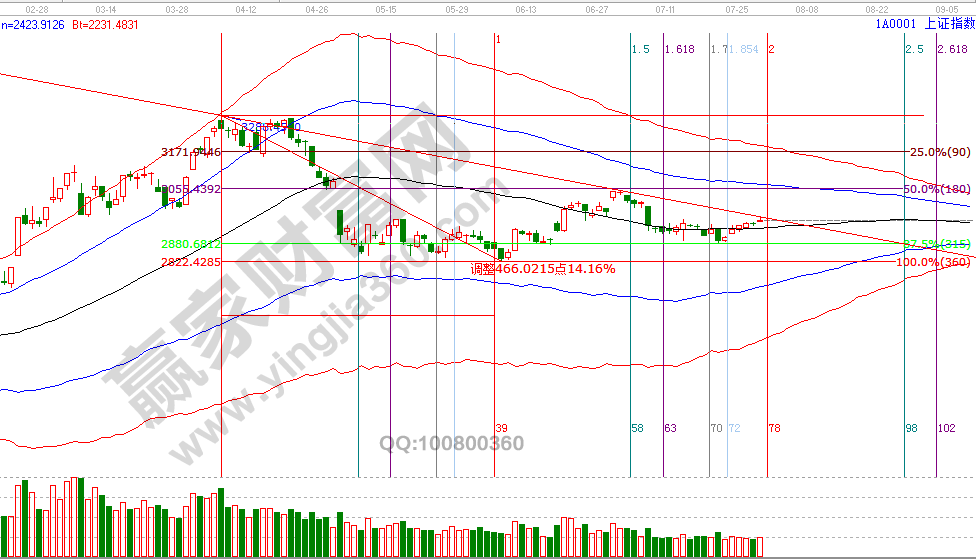 從江恩時(shí)間周期角度分析,市場又到了一個(gè)日線方向選擇區(qū),回顧近幾個(gè)月指數(shù)時(shí)間窗口(3月7號、4月8號、5月17號、6月5號、27號、7月3、15、23號),市場的重要級別、次要級別的時(shí)間拐點(diǎn)都是提前做出測算并公布,今天收盤后贏家江恩技術(shù)團(tuán)隊(duì)將借助工具分享8月時(shí)間窗口,目前公布的第一個(gè)是1號(黃金時(shí)間周期0.618);價(jià)格方面,江恩價(jià)格百分比延伸線2倍零度位2966點(diǎn)與240度2878點(diǎn),是自8號后強(qiáng)調(diào)的具有操作條件的兩個(gè)位置,15、23號分別觸及2878點(diǎn)后回升,昨天是上攻至2966點(diǎn)(最高2965相差一個(gè)點(diǎn))回落,結(jié)合趨勢,時(shí)間、價(jià)格三者綜合判斷,本周后半周持有倉的投資者要關(guān)注好盤面動向,并做好應(yīng)對計(jì)劃策略,7月31號盤中壓力是270度2961點(diǎn)、315度2978點(diǎn),盤中支撐是180度2928點(diǎn)、225度2944點(diǎn)。操作策略,指數(shù)極反通道生命線震蕩,指數(shù)失守60分鐘生命線則反彈信號結(jié)束,向上則關(guān)注60分鐘藍(lán)色上軌線也有望形成反彈結(jié)束信號,投資者保持3成。