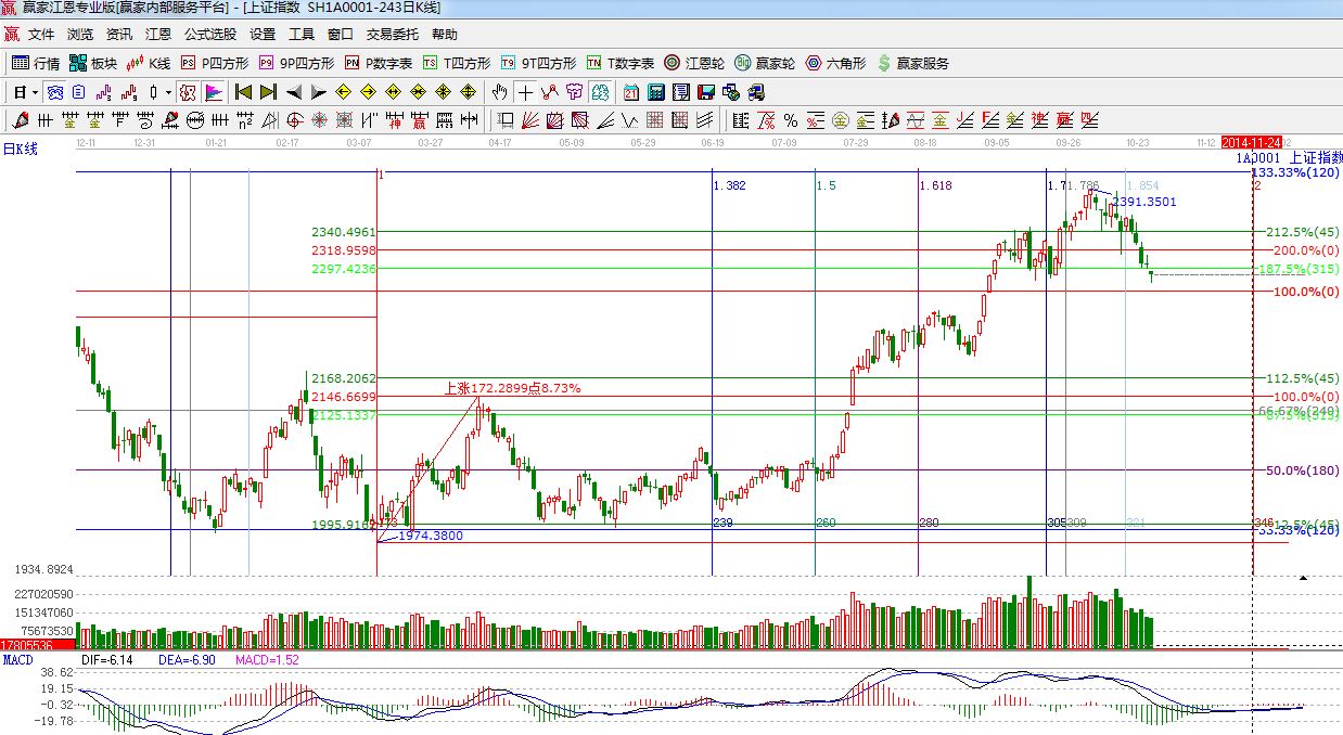 ☆依據(jù)贏家江恩系統(tǒng)黃金時間周期線提示:下一重要時間窗口是11月24日附近。