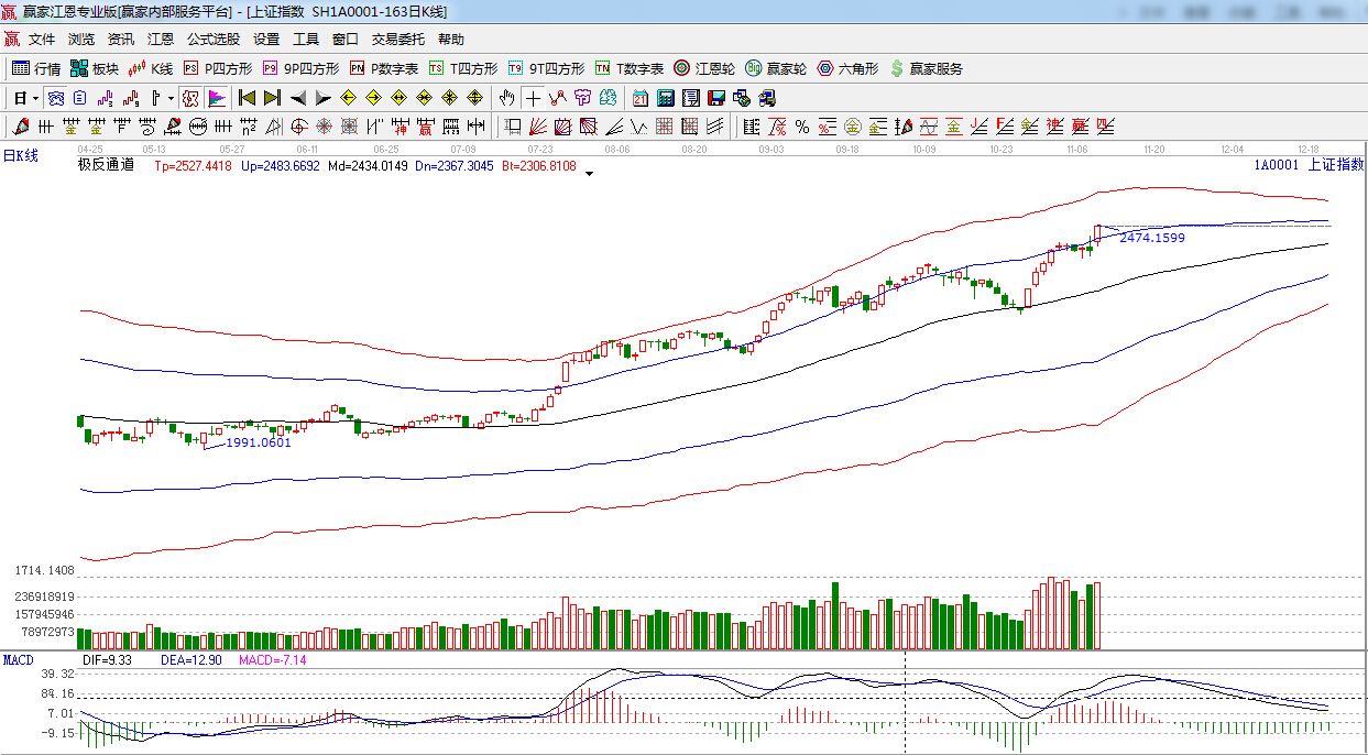 盤面上,受APEC會議確定的重磅利好,金融股和“一帶一路”相關(guān)概念大幅飆升,通用航空、醫(yī)療器械,大飛機(jī)等板塊跌幅靠前,目前上證指數(shù)仍然處在強(qiáng)勢狀態(tài)中,相比之下,創(chuàng)業(yè)板小幅回落,技術(shù)面,明日需關(guān)注上方即將面臨的江恩180度2480點(diǎn)-2489點(diǎn)阻力,預(yù)計(jì)周二大盤維持高位震蕩的走勢。