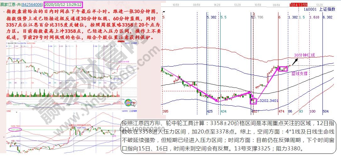 對照當(dāng)下回顧歷史,在提前預(yù)測和實(shí)際走勢的對比中,學(xué)習(xí)感悟江恩時(shí)空技術(shù)的魅力。12日大盤分析,指數(shù)到達(dá)預(yù)期關(guān)鍵位3358點(diǎn),進(jìn)入壓力區(qū)間。但,日線時(shí)間并未走完,空間還有反復(fù),不破3325點(diǎn)仍屬強(qiáng)勢,可繼續(xù)把握個(gè)股機(jī)會。實(shí)則,13日指數(shù)直接低開下探,回踩日線生命線3330一線后,止跌回升再次沖擊3358。全天呈震蕩態(tài)勢,符合預(yù)期分析,等待日線下個(gè)時(shí)間窗。