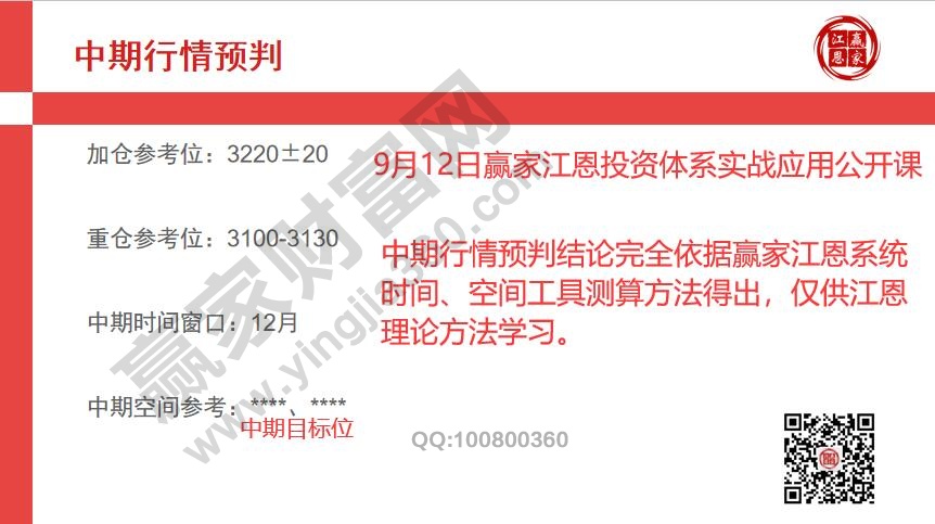 8月初贏家團(tuán)隊對大盤做定性,市場進(jìn)入于第一階段的修整期,在此期間市場不創(chuàng)新高走勢為震蕩緩跌,以大箱體底倉+活動倉做應(yīng)對策略,在時空測算方面,9月12號周六公開課對外揭秘市場中期時空參考信號(8月份用三節(jié)內(nèi)部課已對正式學(xué)員提前做解讀)、自公布測算空間數(shù)據(jù)后,市場已三次觸及3220位置,具體時間分別是9月11日、9月29/30日、10月25日,前兩次均有不同程度的反彈,本次對市場的影響44周周報略有描述,既定28號內(nèi)部培訓(xùn)課講述未來一段時間的操作應(yīng)對策略。