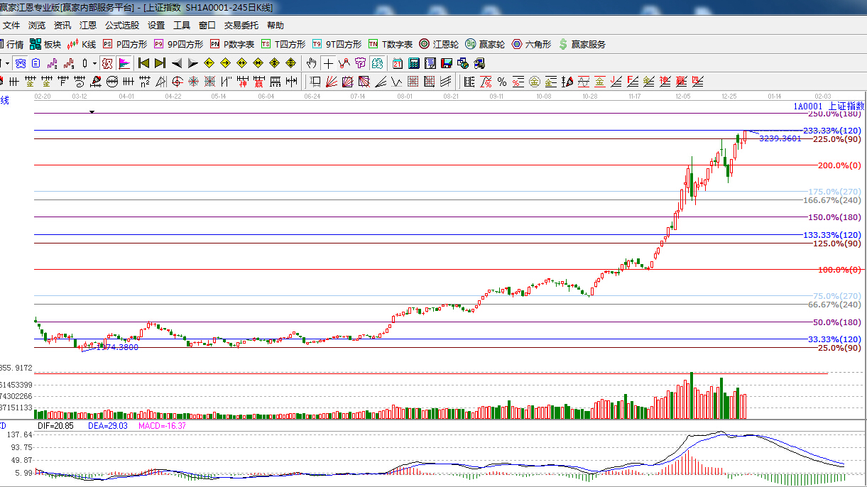 ☆依據(jù)贏家江恩系統(tǒng)波段百分比提示:下方支撐3186點,上方江恩120度3251點阻力。