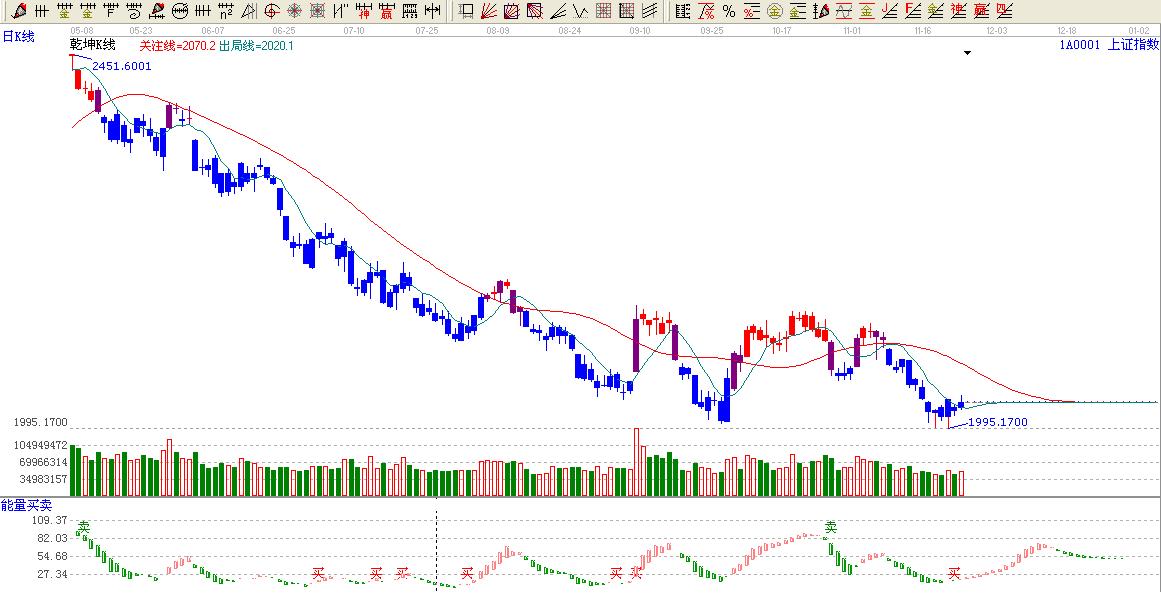 ☆依據(jù)贏家江恩系統(tǒng)乾坤k線提示:大盤還是處于藍(lán)色區(qū)域,看空信號。